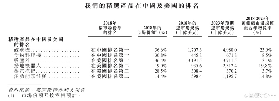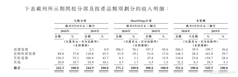SharkNinja分部主要指于2017年9月收购的SharkNinja业务部门,该分部主要在美国提供Shark及Ninja品牌的小家电,主要是家居环境电器及厨房电器。据智通财经APP了解,Shark和Ninja品牌在北美市场有着一定的影响力,在许多产品类别中保持了领先的市场份额。根据弗若斯特沙利文的报告,截至2018年底,Shark品牌在美国吸尘器市场的份额为36.4%,Ninja品牌在美国搅拌机市场的份额为30.2%。