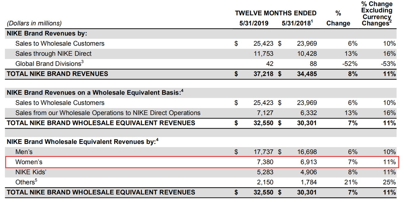 Mark Parker在电话会议中表示,在本季度为运动服鞋类和服装带来了强劲的两位数增长,在女足世界杯前的半年有所加速。尽管财报中对此披露的信息不多,显示在批发渠道方面,女性产品的营收达73.8亿美元,增长率为11%,确实能看出耐克的“她经济”效益不错。