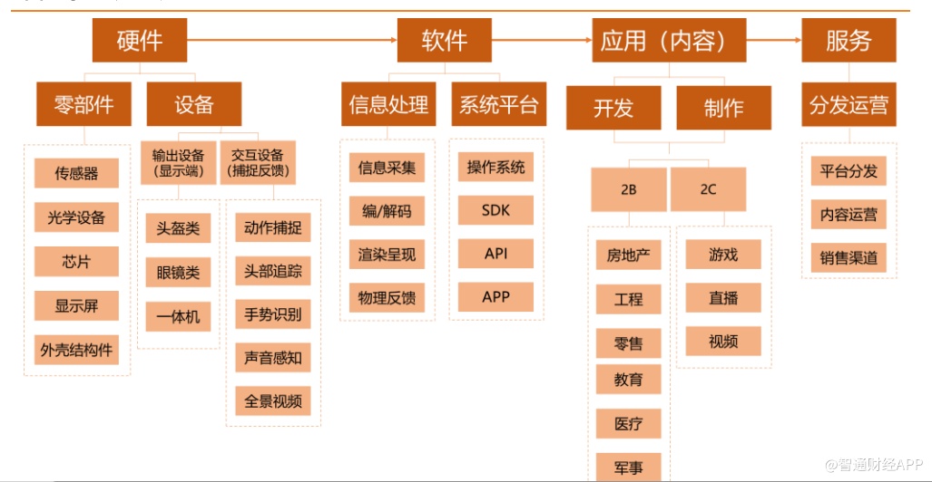 细分来看,AR产业链主要包括四大部分,硬件、软件、应用和内容、以及服务。硬件包括零部件和设备,软件分为信息处理和操作平台,应用和内容则针对不同的行业进行研发和制作,服务则是通过分发平台将应用内容进行渠道分发。