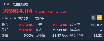 智通财经APP获悉,恒生指数开盘涨361.42点或1.27%,报28904.04点。国企指数涨1.17%%,报11009.41点。红筹指数涨1.4%,报4508.38点。大市盘前成交39.68亿港元。因香港回归纪念日,港股周一休市。