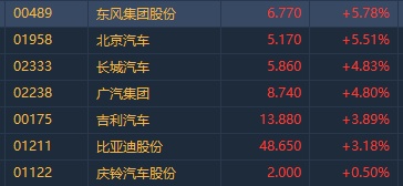 智通财经APP获悉,新能源汽车板块早盘随大市走升,截至发稿,东风集团(00489)、北京汽车(01958)涨超5%,长城汽车(02333)、广汽集团(02238)涨超4%,吉利汽车(00175)、比亚迪股份(01211)涨超3%。