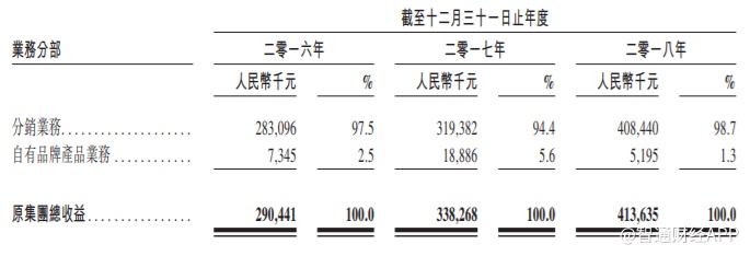 公司的业务主要分为分销业务和自有品牌产品业务,其中以分销业务为主,2016年、2017年、2018年12月31日止,分销业务的应收分别为2.83亿、3.19亿、4.08亿元人民币(下同),占总收入的比例分别为97.5%、94.4%、98.7%。