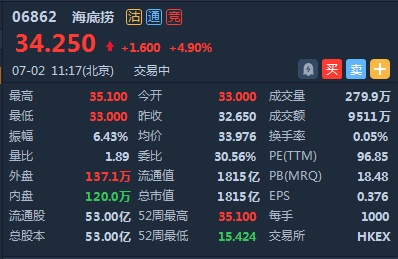 截至11时17分,海底捞涨4.9%,报34.25港元,盘中高见35.1港元创新高。成交额9511万。