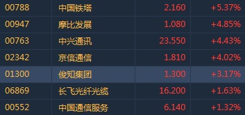 智通财经APP获悉,美企获准继续向华为出售零件,此消息刺激5G概念集体走高。截至14时47分,中国铁塔(00788)涨5.37%,报价2.16港元,中兴通讯(00763)涨4.43%,京信通信(02342)涨4.02%,俊知集团(01300)涨3.17%,中国通信服务(00552)涨1.32%。