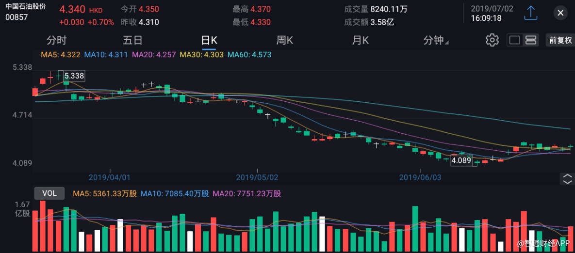 截至今日收盘,中石油(00857)涨0.70%,报4.34港元。