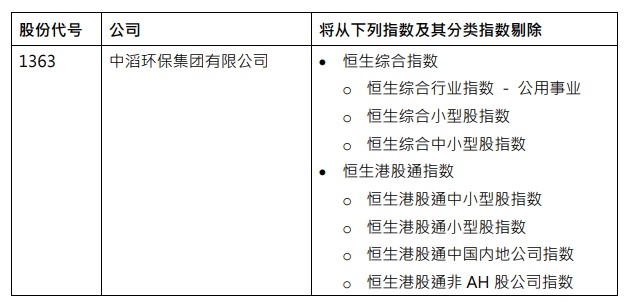 智通财经APP获悉,7月2日,恒生指数公司公示称,由于中滔环保集团有限公司(01363)于香港联合交易所上市之股份持续停牌,其成份股将于2019年7月9日(星期二) 收市后以系统最低价格(即 0.0001 元)从下列指数中剔除。下述变动将于2019 年7月10日(星期三) 起生效。