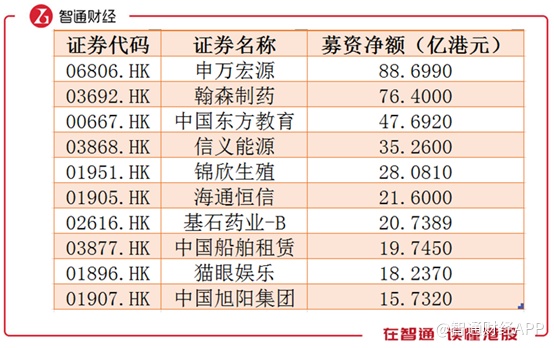 榜单前十名中落差较大,其中,申万宏源(06806)以88.6990亿港元位居榜首,翰森制药(03692)亿76.4亿港元位列第二。第三名之后则不足50亿港元,中国旭阳集团(01907)募资15.732亿港元,位列第十。