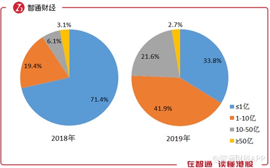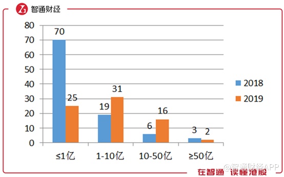 另外据智通财经APP统计,2019年上半年,74家IPO上市公司中,募资净额超过50亿港元的有2家,10-50亿港元的有16家,1-10亿港元的有31家,1亿港元以下的有25家。而去年同期,募资净额同区间公司数量分别为3、6、19和70家。