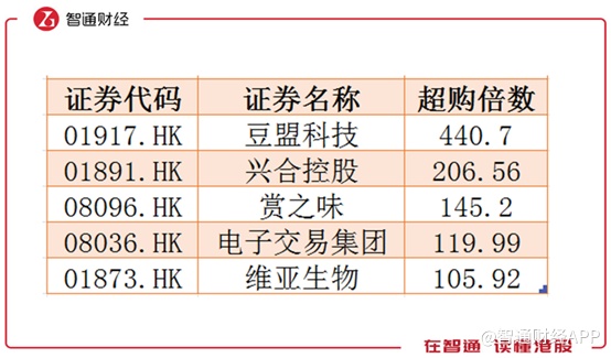 据智通财经APP统计,上半年超购倍数榜单前五中,前四名都集中在一季度,其中3月份上市的豆盟科技(01917),超购倍数高达440.7倍,稳坐第一。兴合控股(01891)、赏之味(08096)、电子交易集团(08036)超购倍数分别为206.56、145.2和119.99倍分居二、三、四名。5月份上市的维亚生物(01873),以105.92倍登上榜单第五名。
