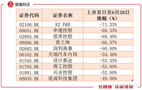 有人欢喜有人忧,截至6月28日收盘,有9家公司股价较发行价跌去50%以上,K2 F&B较发行价股价跌去7成,申港控股、彼岸控股、赏之味等也不遑多让,分别跌去69.3%、68.4%和66.6%。