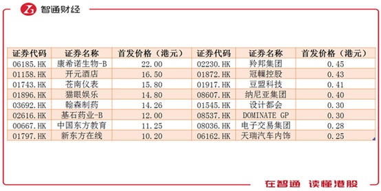 据智通财经APP统计,上半年超过20港元的仅有号称“港股第一疫苗股”的康希诺生物-B(06185),发行价22港元。发行价上双位数的有8家企业,除了康希诺生物-B,还有开元酒店(01158)、苍南仪表(01743)、猫眼娱乐(01896)、翰森制药(03692)、基石药业-B(02616)、中国东方教育(00667)和新东方在线(01797)。