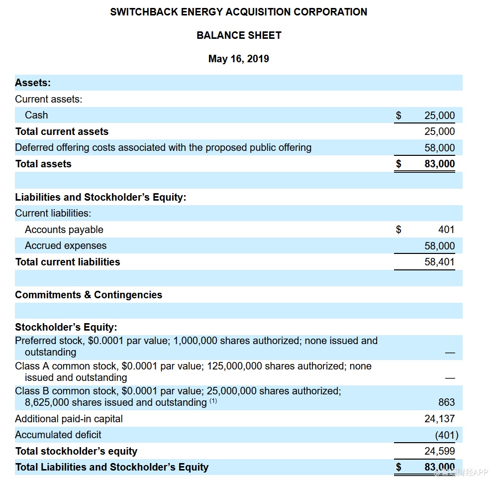招股书显示,Switchback Energy Acquisition Corp是一家新成立的公司,因此,该公司没有经验历史,没有收入,投资者无法评估该公司实现业务目标的能力。公司的资产负债表显示,截至2019年5月16日,公司的现金头寸仅为2500万美金,而公司的递延成本却高达5800万美金。