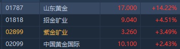 智通财经APP获悉,黄金股早盘表现强势,截至9时20分,山东黄金(01787)涨14.22%,招金矿业(01818)涨4.51%,紫金矿业(02899)涨3.49%。