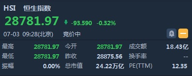 智通财经APP获悉,恒生指数开盘跌93.59或0.32%,报28781.97点。国企指数跌0.31%,报10946.9点。红筹指数跌0.4%,报4486.42点。大市盘前成交18.43亿港元。隔夜美股小幅收高,道指涨近70点,标普500指数再创收盘新高。