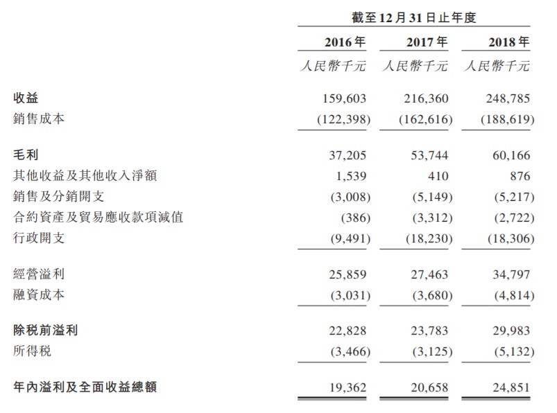 招股书显示,该公司2016年至2018年收益分别为1.60亿元、2.16亿元及2.49亿元;毛利分别为3720.5万元、5374.4万元及6016.6万元;年内溢利分别为1936.2万元、2065.8万元及2485.1万元。