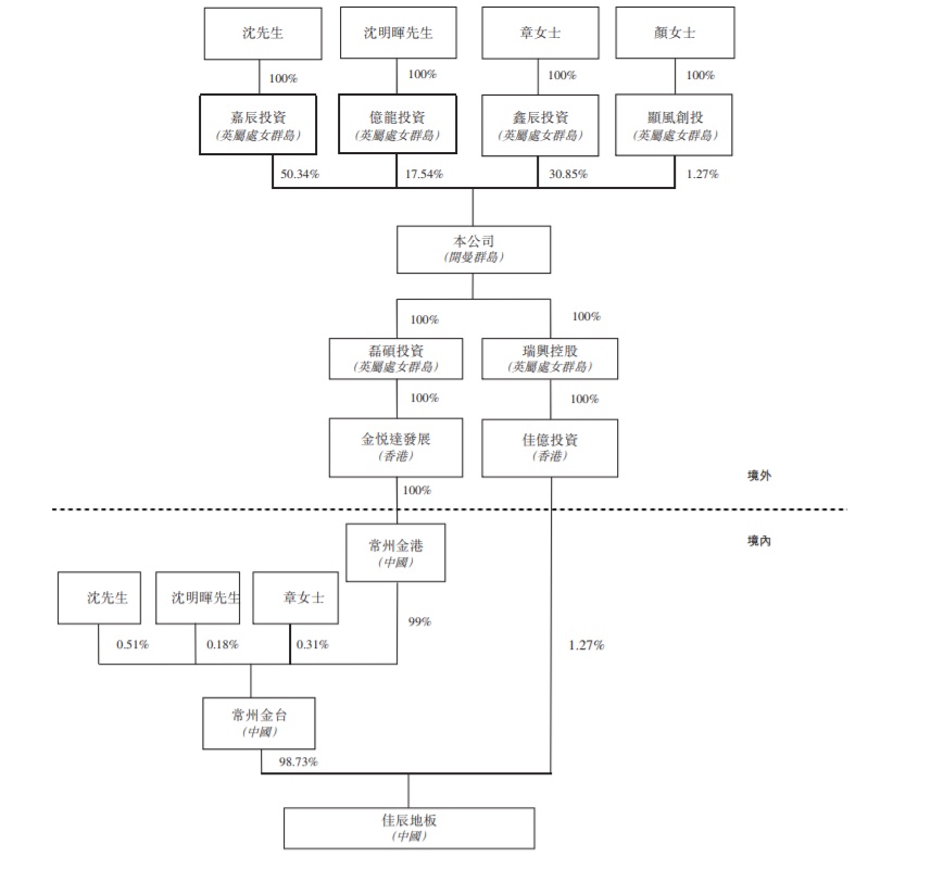 根据上市前投资协议,佳亿投资(一家由颜女士全资拥有的公司)认购佳辰地板注册资本增加的部分。待完成上市前投资,佳辰地板变更为中外合营公司,并有沈先生、章女士、沈明辉先生及佳亿投资分别持有50.34%、30.85%、17.54%、1.27%。