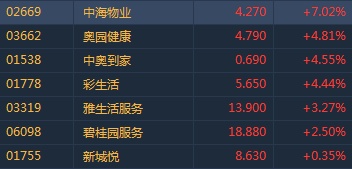 智通财经APP获悉,物业管理板块受市场追捧,中海物业(02669)领涨板块。截至11时18分,中海物业涨7.02%,报价4.27港元,奥园健康(03662)涨4.81%,中奥到家(01538)涨4.55%,彩生活(01778)涨4.44%,雅生活服务(03319)涨3.27%,碧桂园服务(06098)涨2.5%。