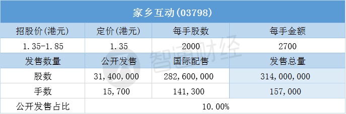智通财经APP获悉,7月3日, 家乡互动(03798)配售招股价区间为1.35-1.85港元,最终定价1.35港元,每手2700港元。