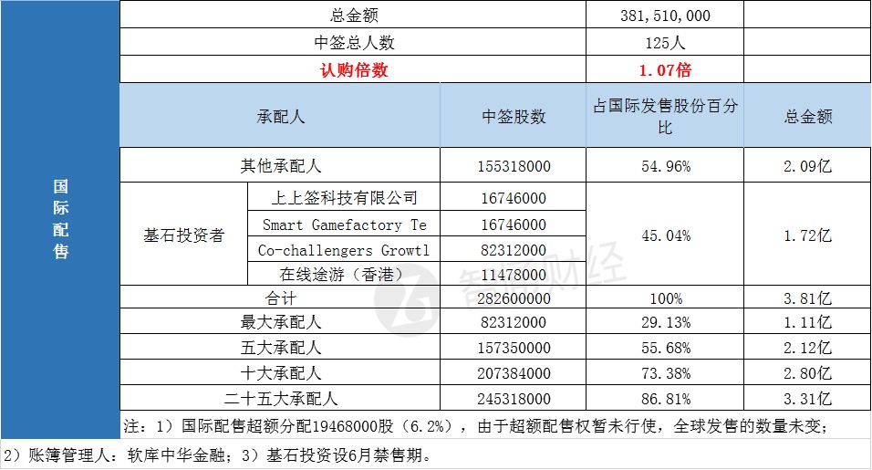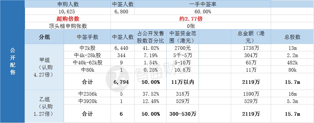 其中,公开配售申购人数10625名,一手中签率60%,认购倍数约2.77倍。