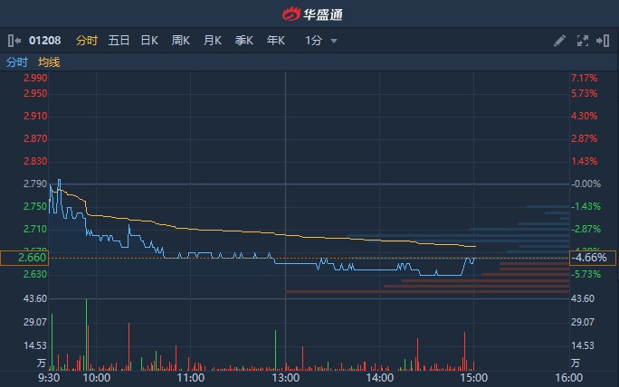 智通财经APP获悉,五矿资源(01208)今日随大市走弱,截至14时59分,跌4.66%,报2.66港元,成交额达1851万港元。