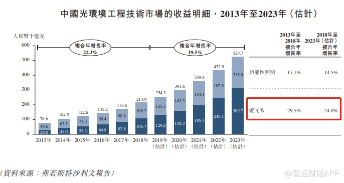 过去几年,中国灯光秀市场飞速发展,复合年增长率达到29.5%,2018年市场规模增长到1057亿元,预计2018-2023年复合年增长率为24%。