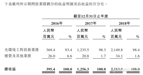 按已确认收益计,通过EPC和PPP模式进行的项目收入占比较大,2018年分别占光环境工程项目已确认收入的54.8%、38.7%。