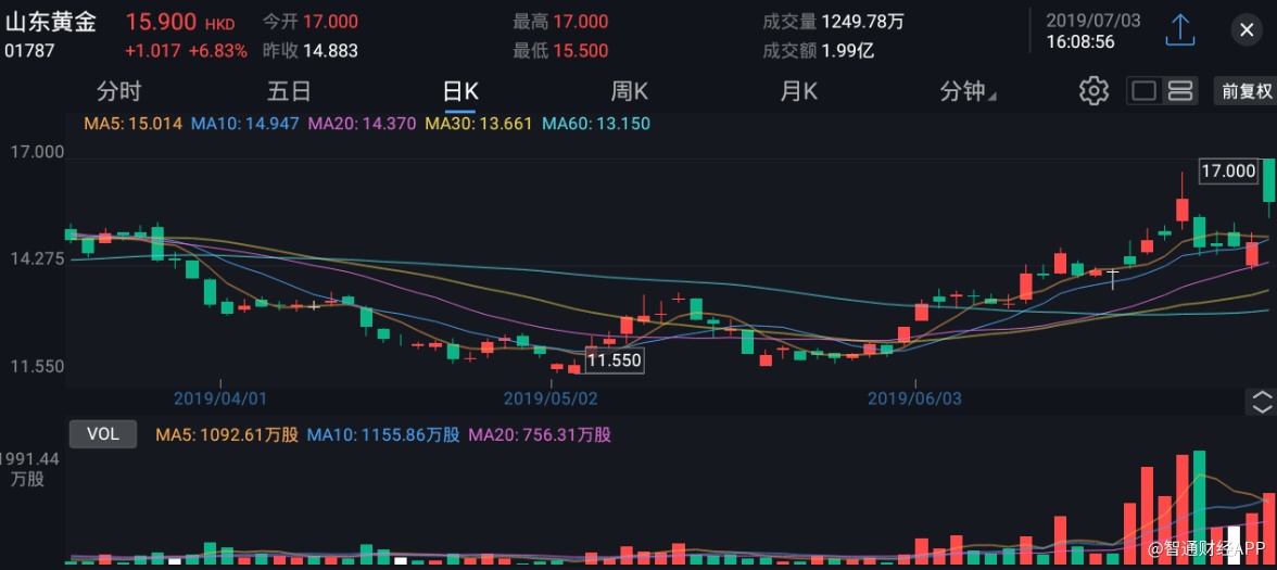 截至今日收盘,山东黄金(01787)涨6.83%,报15.90港元。