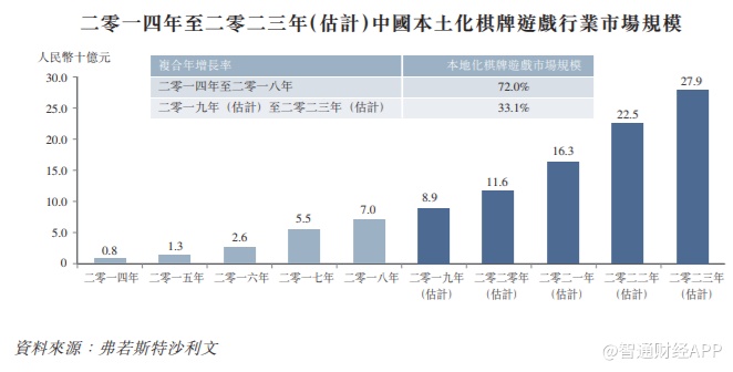 根据弗若斯特沙利文报告,中国本土化棋牌游戏很有的市场规模自2014年的19亿元增加至2018年的70亿元,复合增长率为72%。本土化棋牌游戏的市场规模占手机游戏市场规模约4.3%。该发展的主要驱动包括人们的娱乐需求,以及本土化棋牌游戏的悠久历史。随着2017年其受政府监管,导致市场增长放缓。于2018年,麻将游戏及扑克游戏占本土化棋牌游戏市场总规模约53%及47%。预计2019年至2023年,本土化棋牌游戏市场规模将自89亿元继续增长至279亿元,复合增长率为33.1%。市场增长放缓主要由于市场逐渐饱和,以及不同平台间竞争加剧。