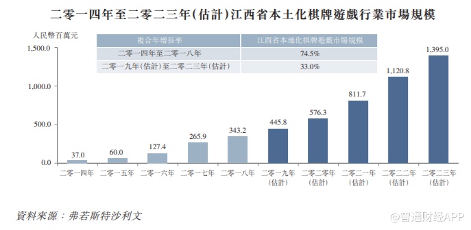 2014年至2018年,江西省本土化棋牌游戏市场规模有90.3百万元增加至343.2百万元,复合增长率为74.5%。2016年及2017年,由于房卡模式的广泛推广,本土化棋牌游戏行业的增长率大幅增加。2017年及2018年的增长率轻微下跌,主要由于政府监管严格。2018年,江西本土化棋牌游戏的市场规模占中国本土化棋牌游戏市场总规模约4.9%。随着本土化棋牌游戏市场逐步规范,江西本土化棋牌游戏行业的市场规模预期将于2023年达到1395百万元,2019年至2023年的复合增长率为33%。