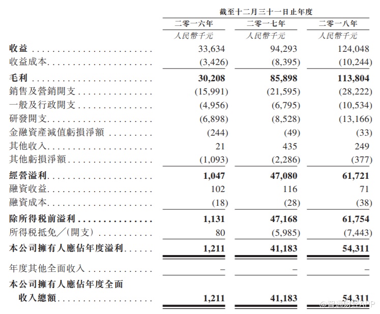 招股书显示,2016-2018年,公司收益分别为3363.4万元,9429.3万元和1.24亿元;毛利分别为3020.8万元、8589.8万元及1.14亿元;公司拥有人应占年度溢利分别为121.1万元、4118.3万元和5431.1万元。