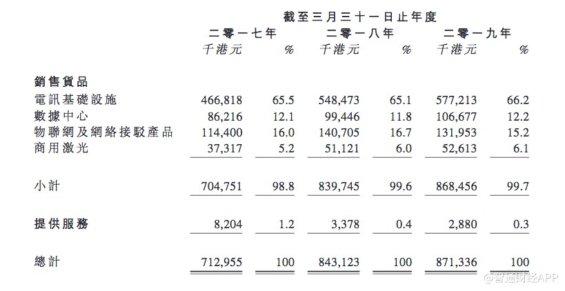 于往绩记录期间,环联连讯的大部分产品应用于电讯基础设施,分别占销售货品65.5%、65.1%以及66.2%;按总收益计算当中约41.9%、40.8%及43.3%产品分别于截至2017年、2018年及2019年3月31日止年度获应用于基站及小蜂窝。