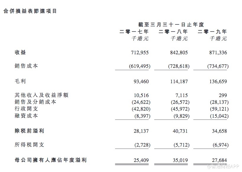 公司于2017年、2018年及2019年3月31日止年度收益维持稳定增长,分别为7.12亿港元、8.42亿港元以及8.71亿港元;母公司拥有人应占年度溢利于2017年为2540万港元,紧接着在2018财年大涨37.83%至3501万港元,随后在2019财年减少20.93%至2768万港元。