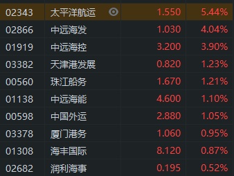 智通财经APP获悉,港口航运股早盘随市走强,截至发稿。太平洋航运(02343)涨5.44%,中远海发(02866)涨4.04%,中远海控(01919)涨3.9%。
