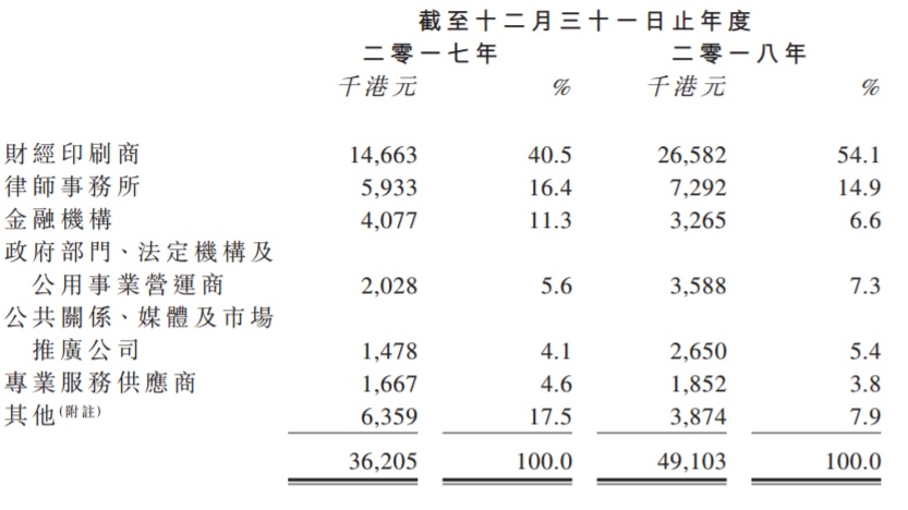 国际语文公司于往绩记录期间有逾800名来自各行各业的客户,包括财经印刷商、律师事务所、政府部门、媒体及市场推广公司等。截至2017年及2018年12月31日止年度,其五大客户合共分别占总收益约43.8%及60.1%,而最大客户则分别占总收益约27.1%及33.3%。