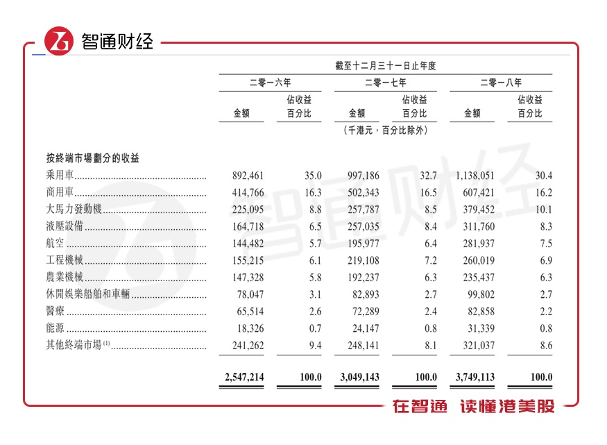 2018财年间,鹰普精密实现营业收入分别为25.5亿港元、30.5亿港元、及37.5亿港元。其中,乘用车、商用车、大马力发动机、航空、液压设备为目前对公司收入贡献最大的五大终端市场。