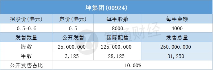 智通财经APP获悉,7月4日,坤集团(00924)配售招股价区间为0.5-0.6港元,最终定价0.5港元,每手4000港元。