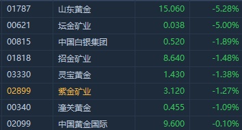 智通财经APP获悉,前期避险资金抱团的黄金股今日普遍回调。截至发稿,山东黄金(01787)跌5.28%,中国白银集团(00815)跌1.89%,紫金矿业(02899)跌1.27%。