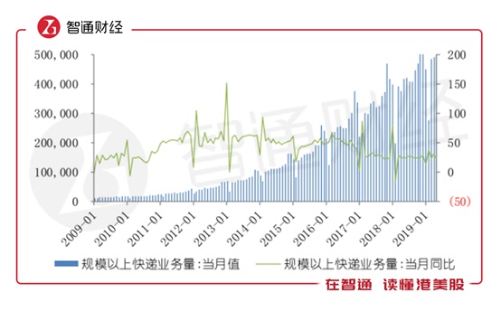 而快递方面,“618”年中旺季全行业共揽收快件31.9亿件,同比增长26.6%;最高日处理量超过2.43亿件,同比增长54.8%,比日常处理量高出27.9%,预计“618”活动期间,全行业揽收快件将超过36.3亿件,同比增长高达29.6%。电商业务的持续火爆,将为快递行业带来稳定增长动力,目前来看,6月行业件量增速有望达到35%,龙头企业件量增速有望超过50%,2019年全年行业业务量有望保持25%的增速,收入保持20%以上的增速。