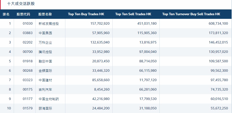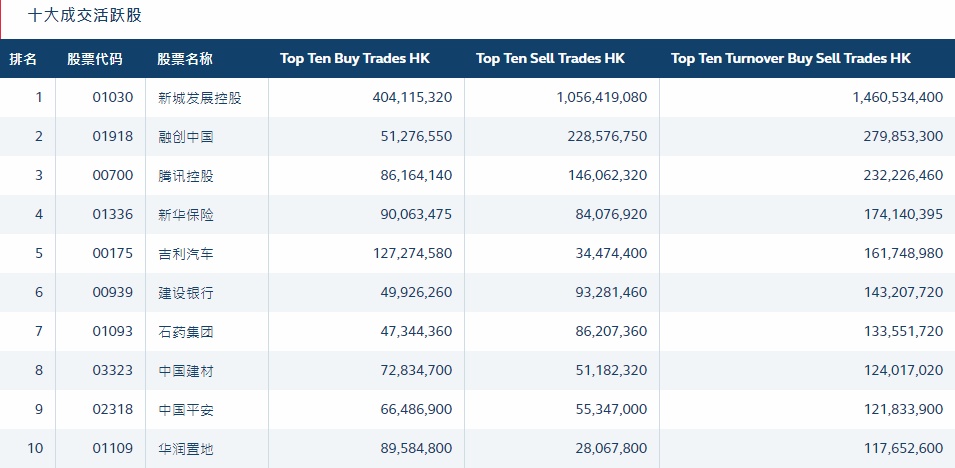 新城发展控股(01030)成为今日港股市场交投最活跃的个股,全日成交额达39.99亿港元,20.69亿内地资金参与交易,买入额达5.62亿,卖出额达15.07亿,净卖出额高达9.46亿港元。大跌之下抄底资金也不少,昨日3.07亿内资通过港股通账户买入新城发展控股(01030),这些资金若今日仍未抛售,收盘账面浮亏将达3244.99万港元。