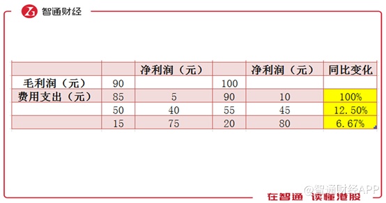 实际上是因为费用支出太高净利率太低,导致净利润的额度变化对增长变化的影响加大的原因。如下表,举个简单例子,在毛利润一定,费用支出不同,但是同比每次都是增加5元,然后净利润的变化却大相径庭。