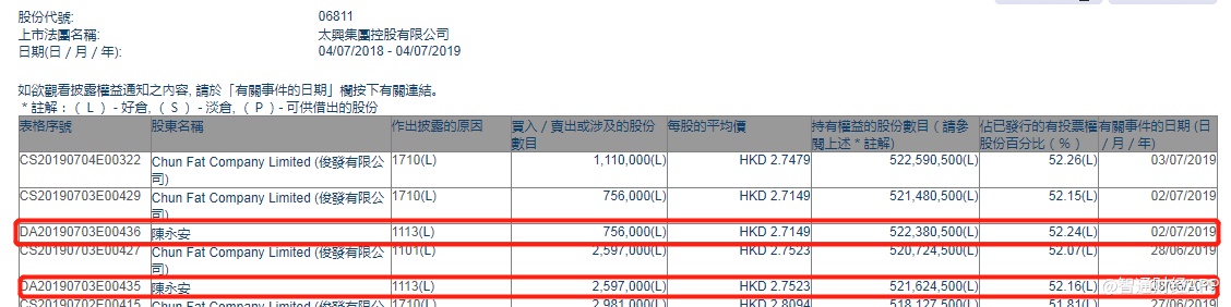 智通财经APP获悉,根据联交所资料显示,太兴(06811)创办人陈永安于上周五及本周二(28日及2日)两个交易日再增持太兴合共336万股,每股平均价2.75元及2.71元,总值约922万港元,最新持股数目约5.22亿股,最新持股量增至52.24%。