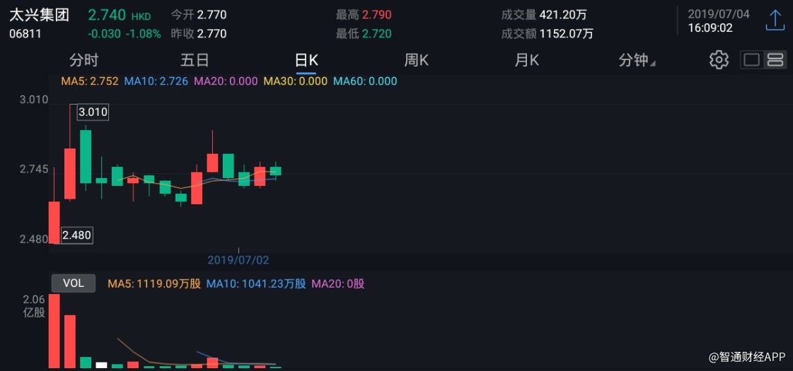 截至今日收盘,太兴(06811)跌1.08%,报2.74港元。
