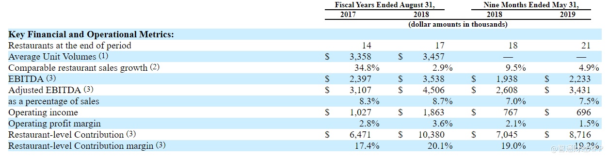 招股书显示,截至2019年5月31日,公司在美国加利福尼亚州、德克萨斯州、佐治亚州和伊利诺伊州共经营着21家餐厅,并预计未来门店的数量将会以每年20%的速度增长。