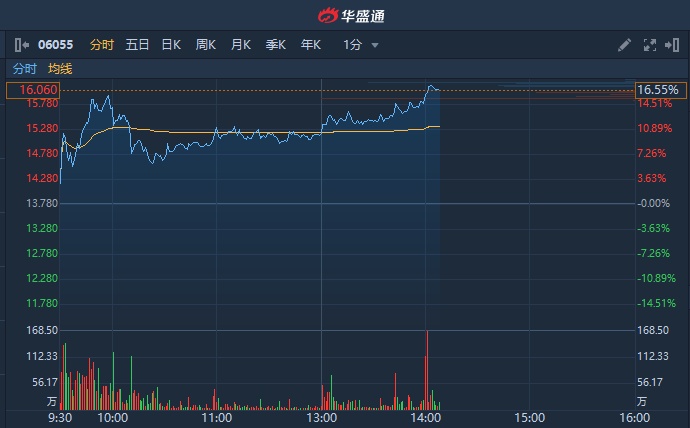 智通财经APP获悉,中烟香港(06055)早盘冲高回落,午后攻势再起,涨幅逐步扩大。截至14时7分,涨16.55%,报16.06港元,成交额达7.609亿港元。