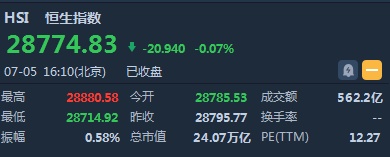 智通财经APP获悉,恒指早盘微跌0.04%,报28785.53点。截至收盘,恒生指数跌20.94点或0.07%,报28774.83点,全日成交额达562.22亿。国企指数跌0.17%,报10895.1点,红筹指数涨0.19%,报4519.49点。