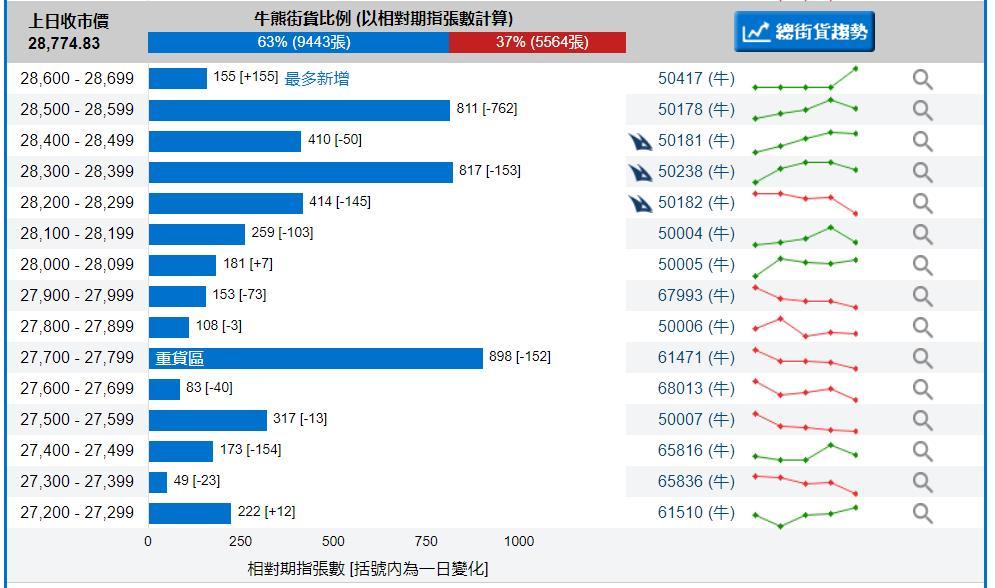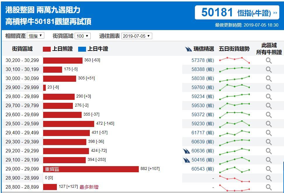 智通财经APP获悉,截至7月5日,恒指最新的牛熊街货比例63:37。瑞信恒指牛熊证街货分布图中的数据显示,熊证街货重货区在29000-29099区间,该区间最新熊证数量为882张,较上一交易日增加107张;最多新增区间在28000-28899区间。牛证街货重货区在27700-27799区间,该区间最新牛证数量为898张,比上一交易日减少152张;最多新增区间在28600-28699区间。