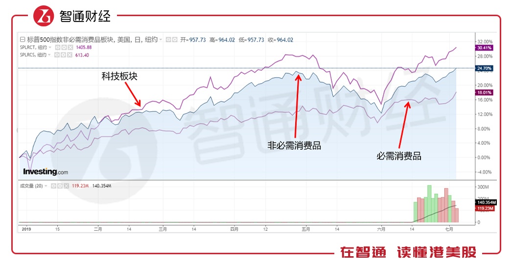 而据智通财经APP观察发现,除1月份较短一段时间内标普500指数科技板块弱于必需消费品板块,其他大部分时间段非必需消费品与科技板块均位于必需消费品上方。从上半年整体涨幅来看,科技板块与非必需消费品分别位列第1、第2名,两者涨幅均大幅强于必需消费品涨幅。
