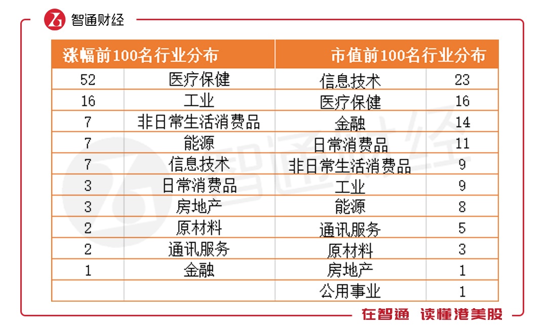 从市值排名来看,截至2019年6月28日,在美股市值前100名行业分布主要集中在信息技术、医疗保健、金融三个行业。其中,医疗保健行业除较多标的排名靠前外,在上半年涨幅前100名的企业数量上也占绝对性优势。