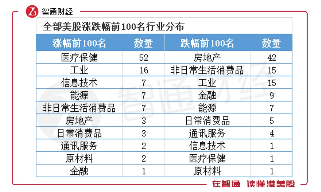 相比涨幅前100名绝大多数集中于医疗保健行业,美股上半年下跌幅度前100名集中度最多的行业为房地产,占比达42%。