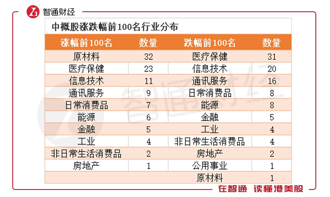 从中概股上半年的涨跌幅表现来看,涨幅排名前100集中度最多的行业为原材料、医疗保健、信息技术。其中,医疗保健、信息技术行业分化现象明显,在跌幅前100名及涨幅前100名行业分布中均位居高位。